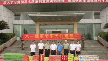 2015-05-04“八一”建军节之际,在这个特别的节日,双流县临空管委会副主任青长国等领导,四川金年会总经理陈维秀、副总经理段南、党委书记周斌及公司员工先后前往双流县消防队、78649部队对一线广大官兵送上了炎热天气解暑的饮料、水果和节日的问候和祝福。